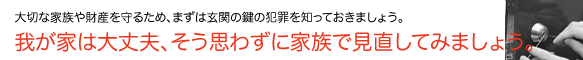 あらゆる犯罪の中で、もっとも多いのが空き巣ねらいの侵入、事務所荒らしです。ここでは知っておきたい、知っておきべき犯罪と対処法をいくつか説明致します。さまざまな対策を練り、泥棒、犯罪に合わない防犯対策を心がけましょう。まずは身近な玄関の鍵の防犯から。泥棒が嫌がる家作り、住まいづくりが必要です。ご家族でもう一度、ご自宅の防犯について確認して見ましょう。ここでは、犯罪と対処法のご紹介をします。